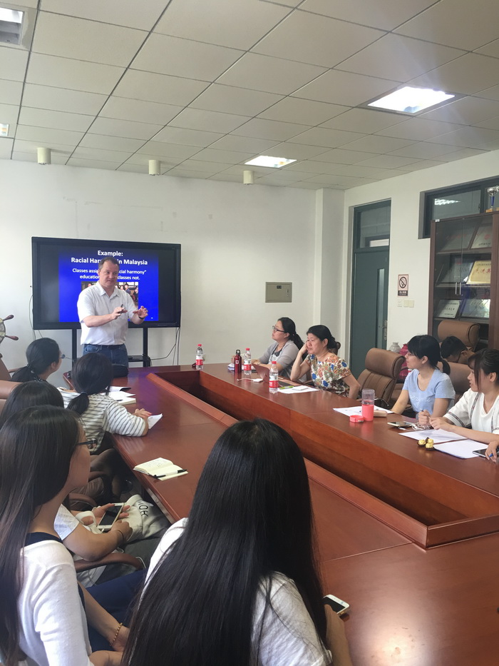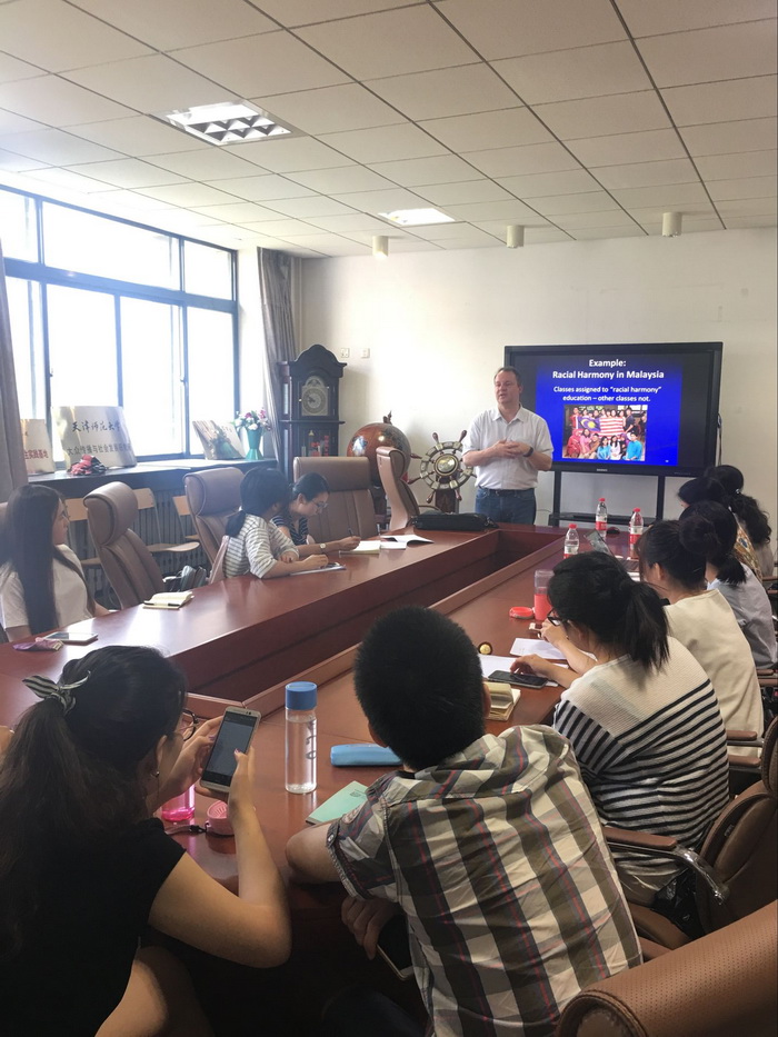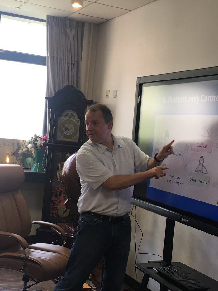 7月6日上午9点,美国肯塔基大学新闻与传媒学院院长拉尔斯•维纳教授在天津师范大学新闻传播学院会议室为研究生讲授设计实验的基本方法,在维纳教授讲授的过程中,新闻系李净昉老师担任翻译。